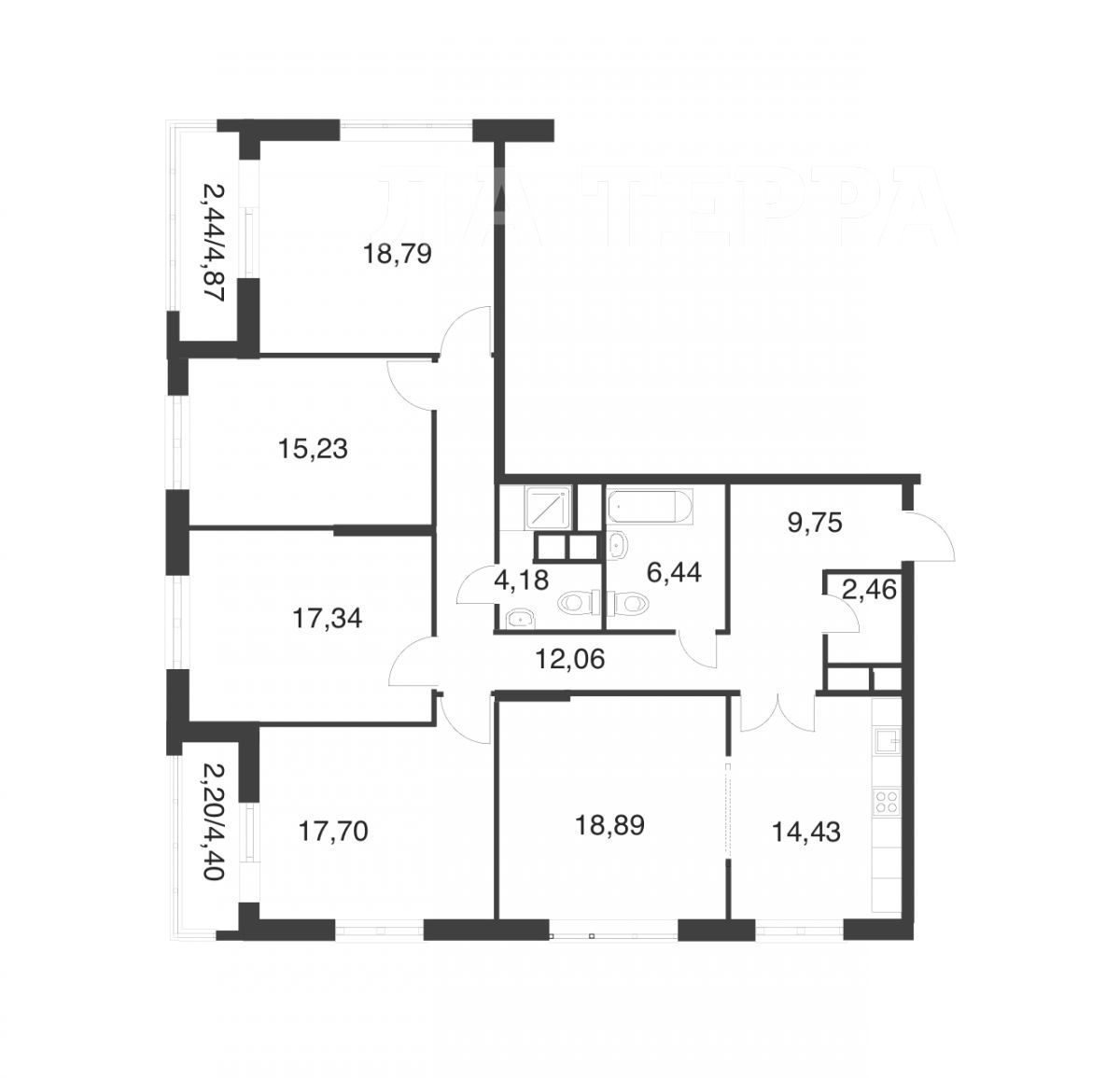 Площадь комнат19.03 м2, 18.79 м2, 17.73 м2, 17.34 м2, 15.24 м2